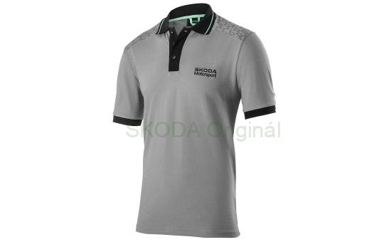 Pánská polokošile Motorsport v šedé barvě s aplikací vzoru na ramenou a horní části zad. Černý límeček s electric green proužkem, zapínání na tři knoflíčky. Na prsou vyšitý nápis Škoda Motorsport v délce 7 cm, na levém rameni vyšitý nápis VRS v délce 5 cm na pravém nápis Škoda v délce 5 cm.